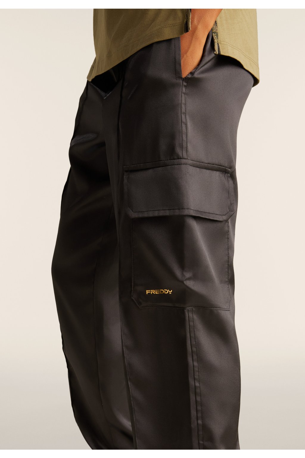 cargo nohavice v pohodlnom strihu Comfort fit sú vyrobené z elastického materiálu s jemným hodvábnym efektom, ktorý si okamžite zamilujete. Klasický pás s vnútornou gumou a praktické stiahnutie spodného lemu gumičkou sa postarajú o to, aby ste sa v nich cítili maximálne komfortne po celý deň. Nohavice majú nenápadné predné vrecká a štýlové cargo vrecko na ľavej nohe, ktoré zdobí decentné logo FREDDY v svetlozlatej farbe.