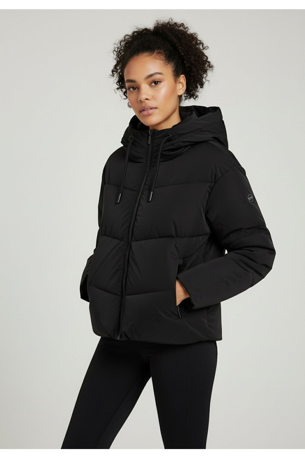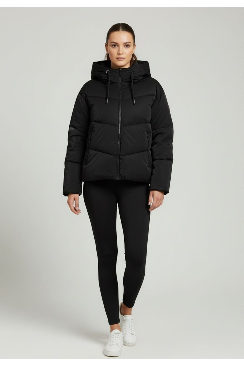 Pohodlná skrátená bunda s voľným strihom, ideálna pre športový a dynamický štýl. Strih je možné upraviť vďaka sťahovacej šnúrke s poistkami na spodnej časti. S ekologickým nepravým páperím, ktoré je šetrné k zvieratám, chráni pred chladom a zároveň zachováva ľahkosť a mäkkosť. Rolák a kapucňa so šnúrkou, dlhé rovné rukávy a vrecká na zips pre všestranný a praktický vzhľad. Na ľavom rukáve je aplikované logo z kryštálikov.