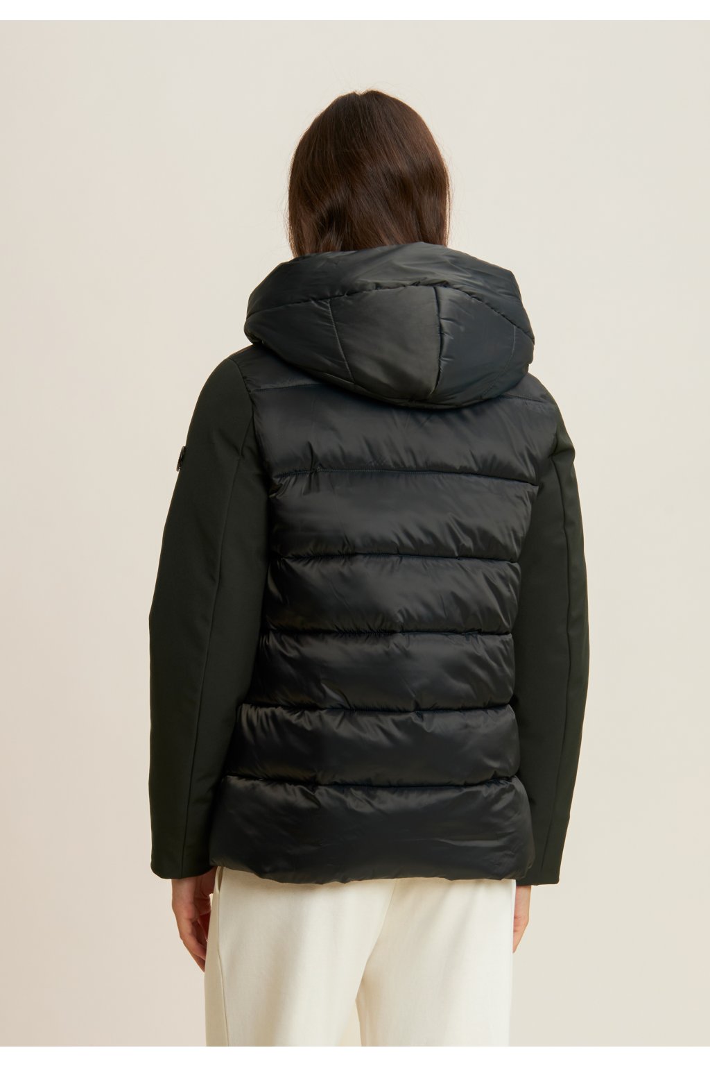 Dámska stredne dlhá páperová bunda s lesklými a matnými prvkami.