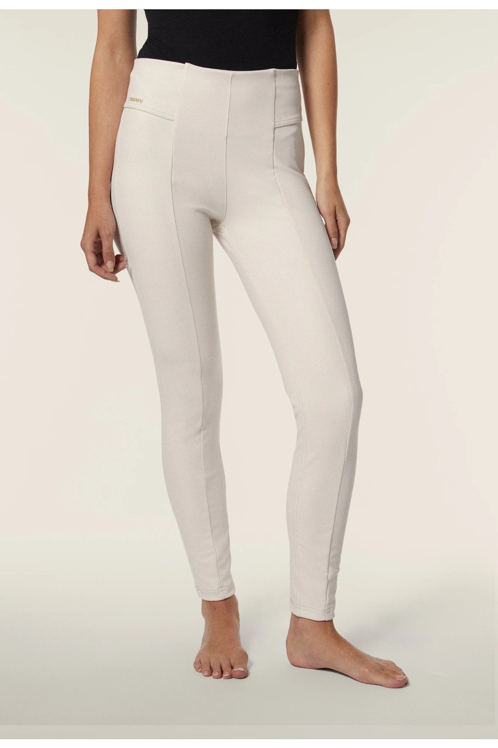 Povrchová úprava dodáva materiálu lesklý a sofistikovaný vzhľad, ideálny pre moderný a atraktívny outfit. Zvislý šev v strede nohavíc opticky zoštíhľuje postavu, zatiaľ čo absencia predných vreciek vytvára čistý a elegantný dizajn.