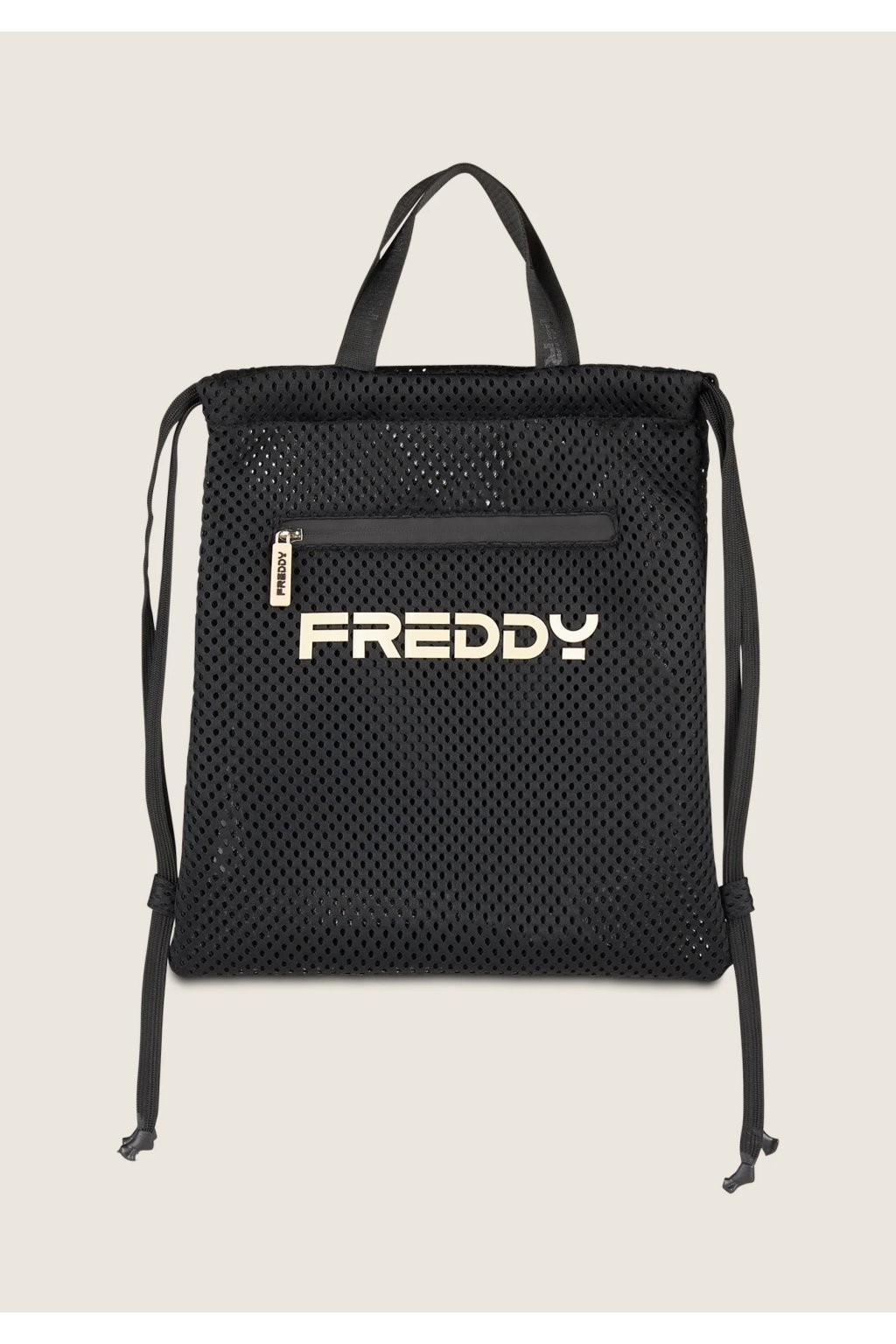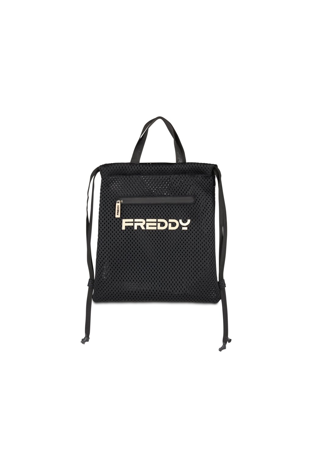 Tento ľahký a udržateľný čierny batoh z recyklovaného polyesteru s logom Freddy spája praktickosť s priedušnosťou vďaka sieťovanému materiálu a vďaka dvojitým šnúrkovým popruhom, rúčkam na prenášanie a vnútornému vrecku na zips predstavuje ideálne riešenie pre rýchly a štýlový prístup k vašim veciam v posilňovni aj počas voľného času (rozmery: 33,5 x 40 cm).