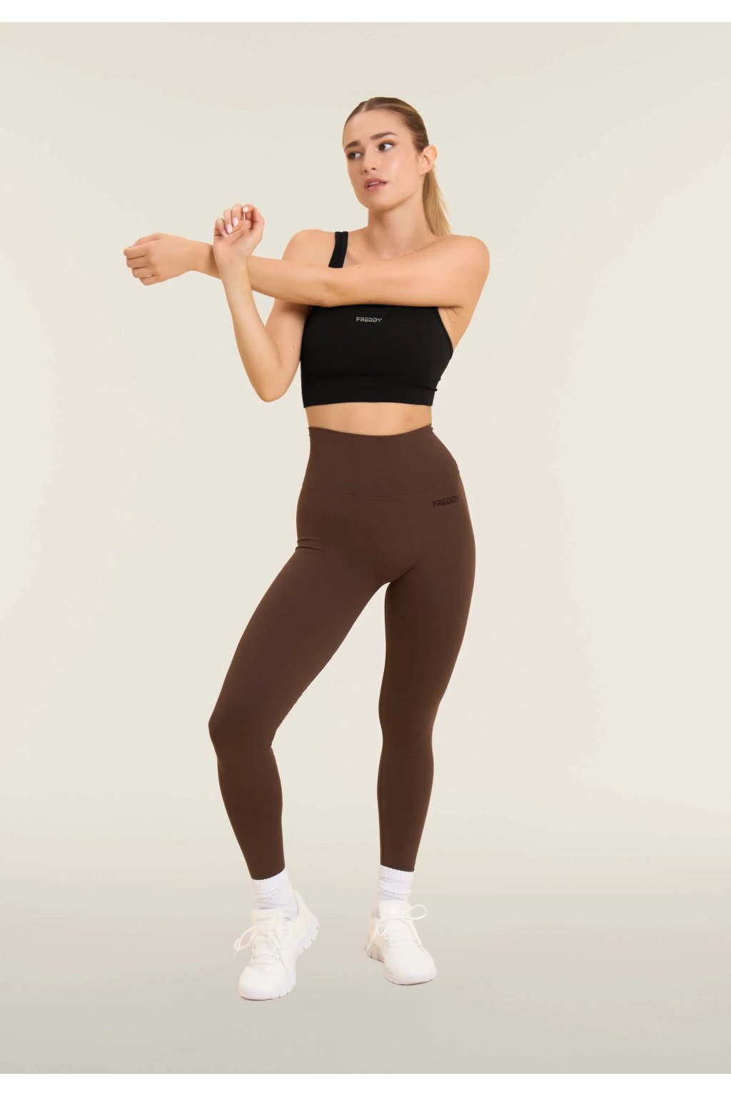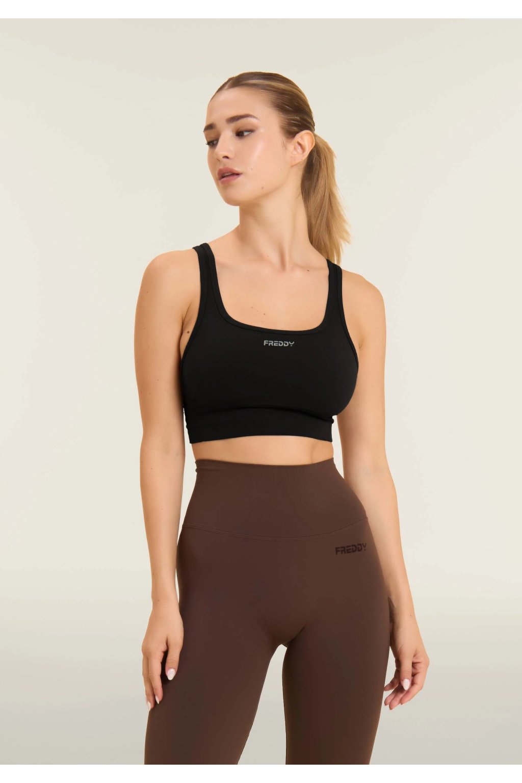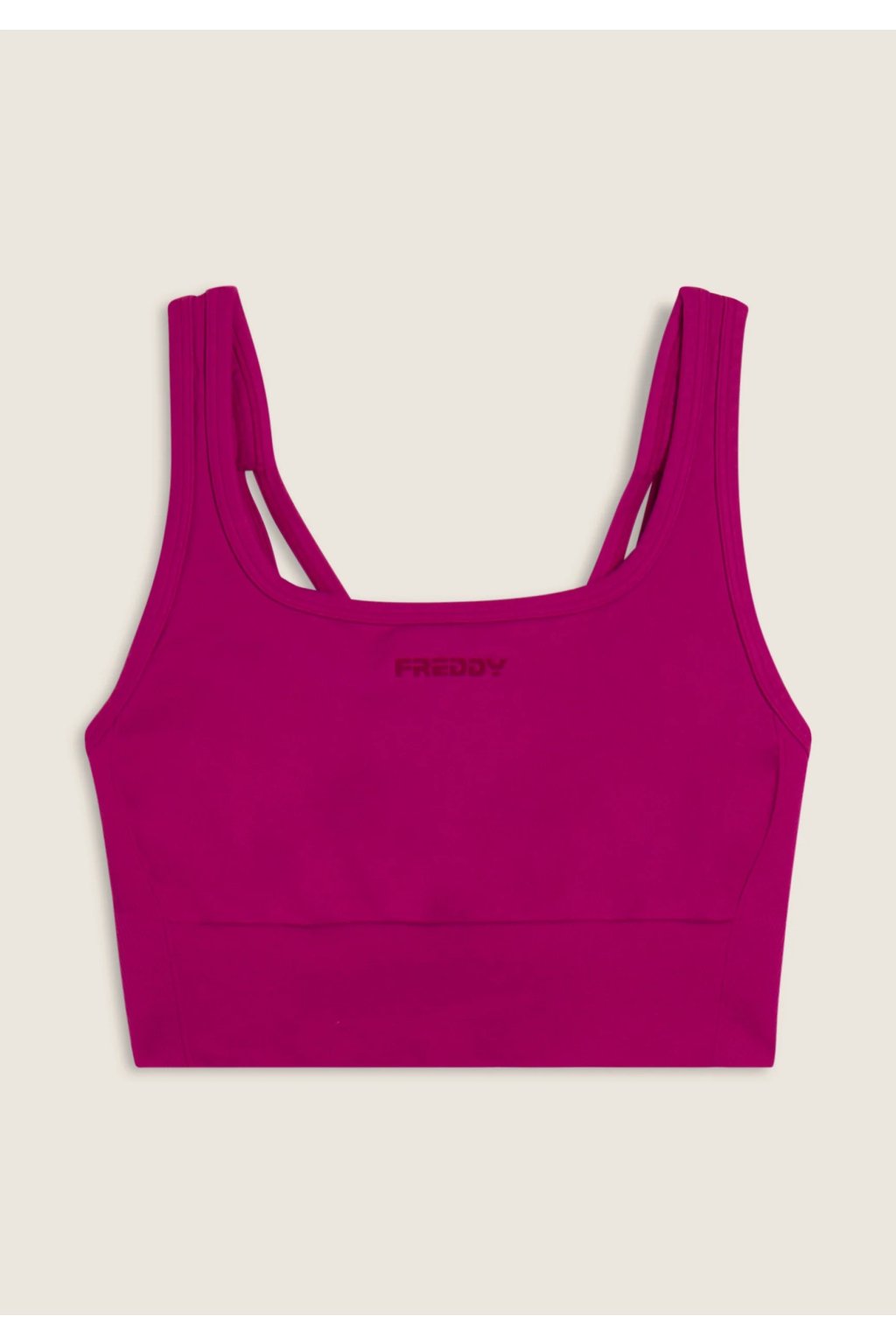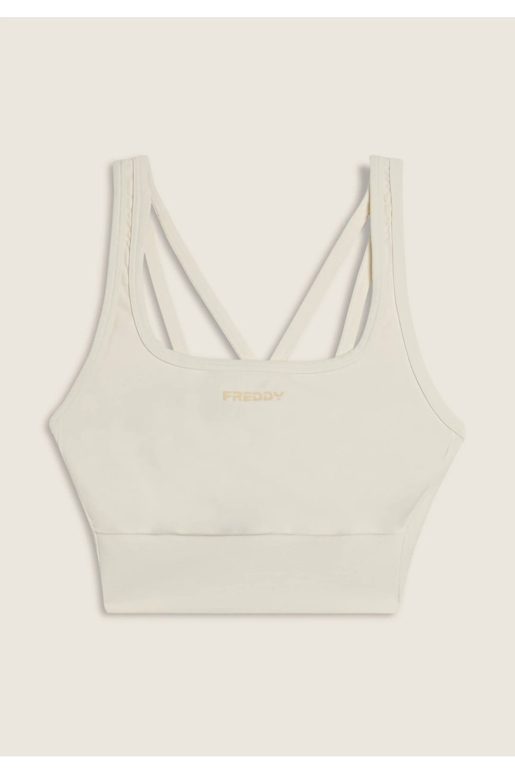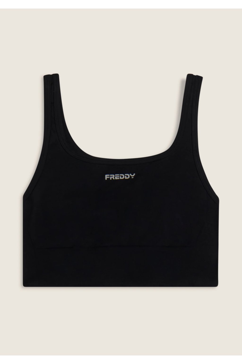 Športová podprsenka so strednou podporou s bočnými rebrovanými vložkami. Vyrobená z technického bezšvového materiálu, ktorý obopína telo s jedinečnou jemnosťou, zabezpečujúc podporu a slobodu pohybu. Kruhový výstrih, pravidelné ramienka skrížené na chrbte a logo FREDDY pre športový a elegantný vzhľad.