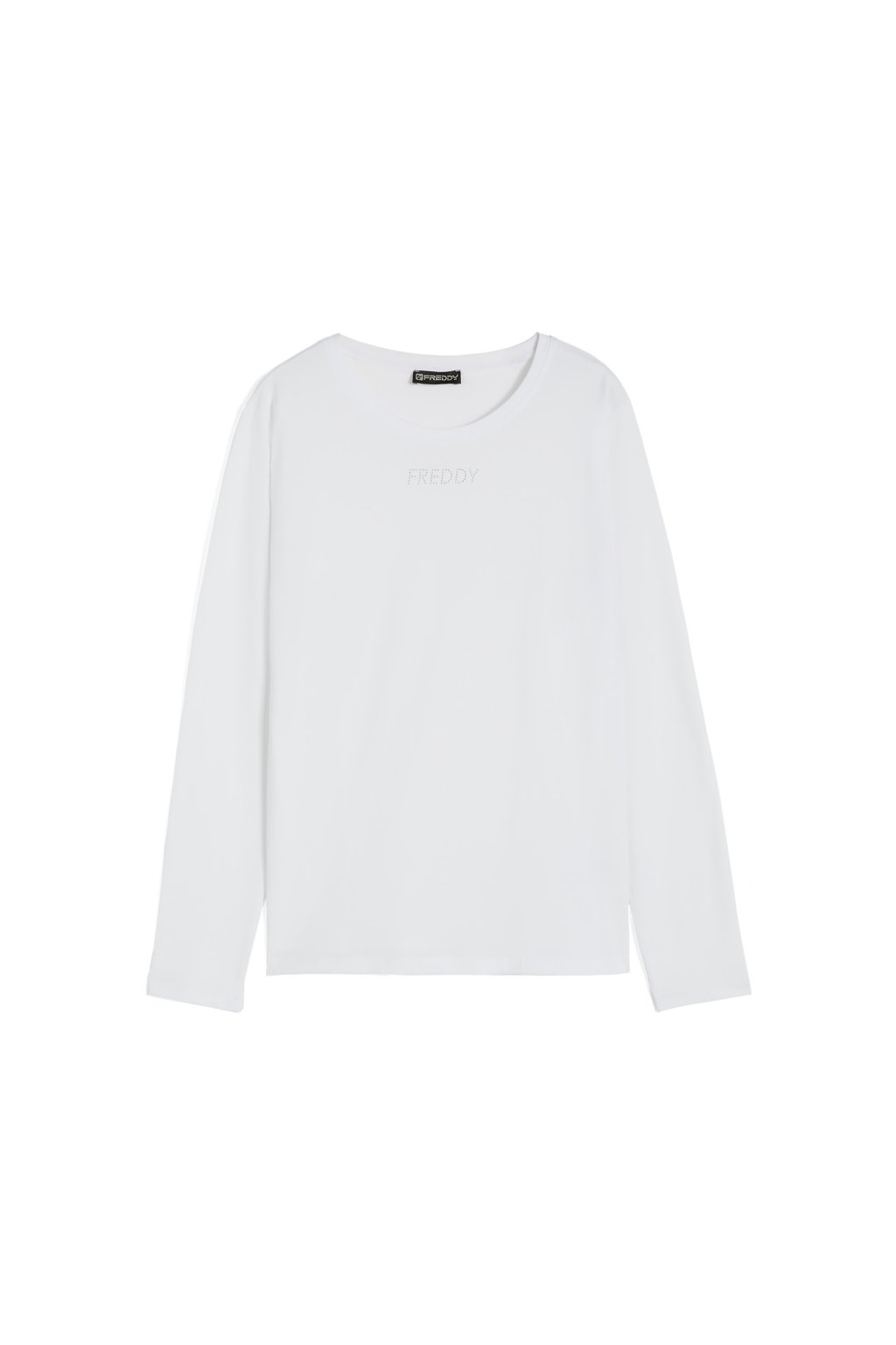 Tričko s dlhým rukávom z ľahkého bavlneného džerseja zdobené na prednej strane malým logom FREDDY zloženým zo strieborných mikropolíčok. Klasický strih s výstrihom a rovným lemom spolu s regular fit strihom a prirodzene mäkkou tkaninou jemne kopírujú línie tela a zabezpečujú absolútnu voľnosť pohybu. Ideálne tričko na športovanie, ale aj na dotvorenie outfitov na voľný čas, ktoré ponúkajú pohodlie a štýl.