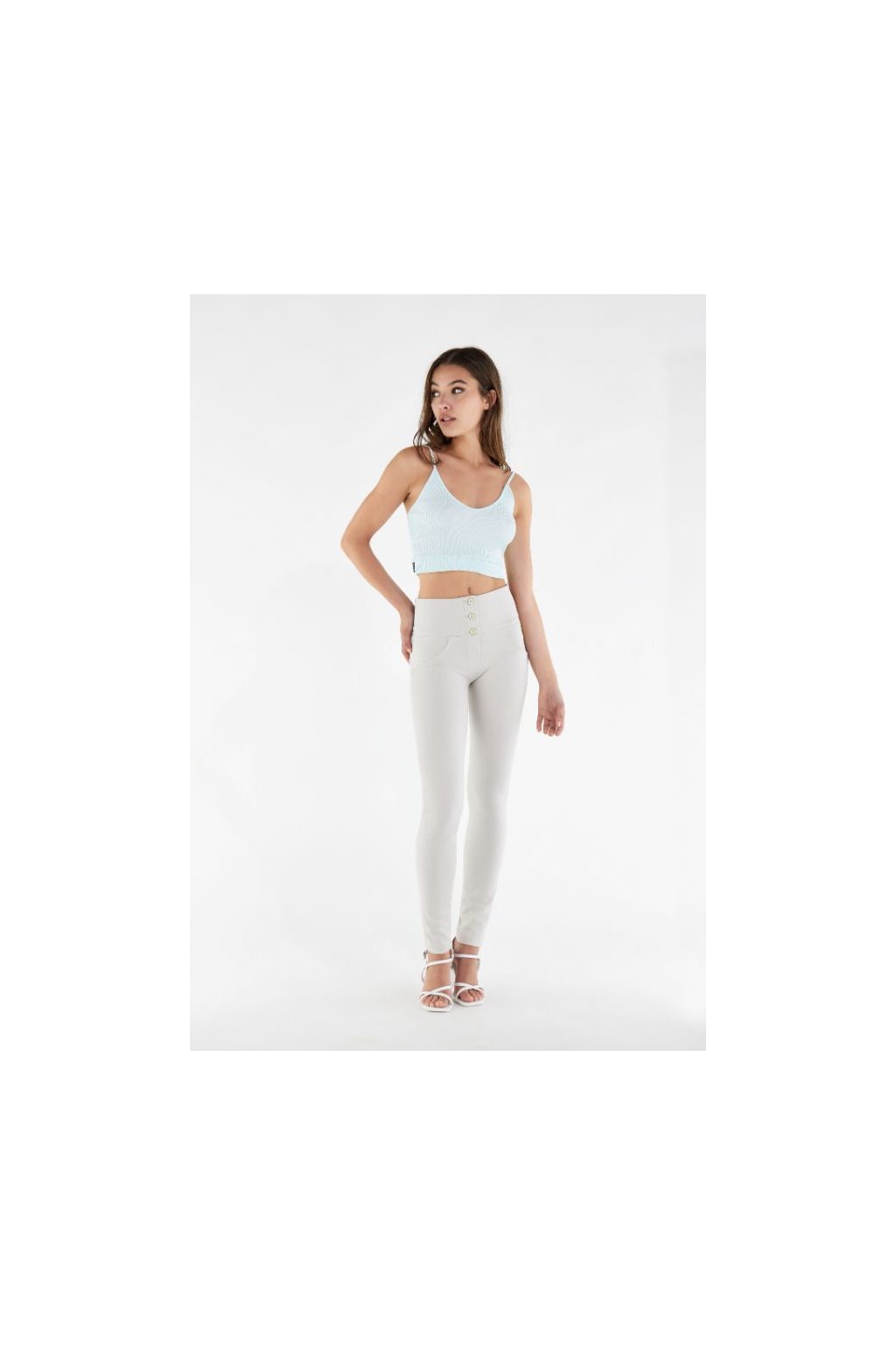 Push-up nohavice z radu WR.UP® z organickej bavlny s recyklovaným elastanom, ideálne na skrášlenie každého okamihu dňa bez obetovania slobody pohybu. Model má vysoký pás so zapínaním na 3 gombíky vpredu, ktorý vytvaruje pás, 7/8 dĺžku v oblasti členku, ktorá zoštíhľuje nohu, a superskinny strih, ktorý maximálne priľne k tvaru tela. Odev je navrhnutý tak, aby zvýraznil Vaše krivky, je umocnený tvarovacím efektom, ktorý je daný inovatívnou technológiou FREDDY WR.UP®. Je to dokonalý a zároveň pohodlný odev na dotvorenie vášho outfitu.