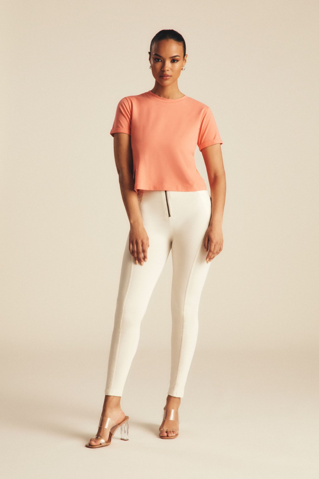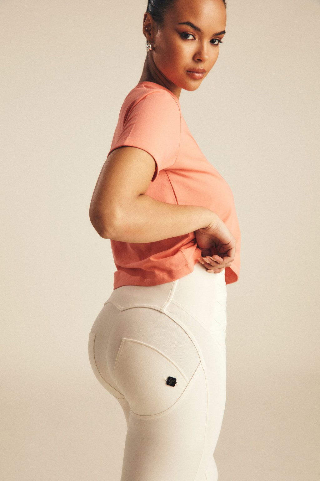 WR.UP® Bavlnené nohavice s vysokým pásom krémovej farby s ozdobným prešívaním. Zloženie: 81% Bavlna, 19% Elastan.