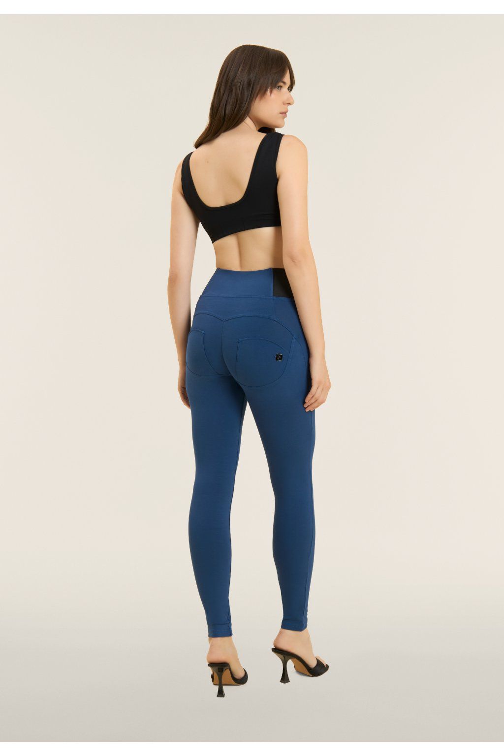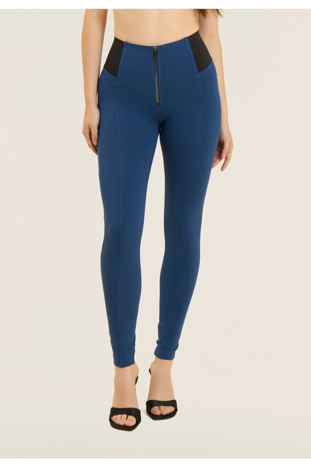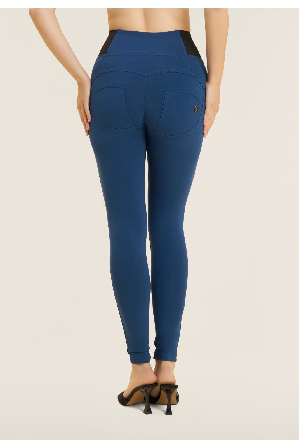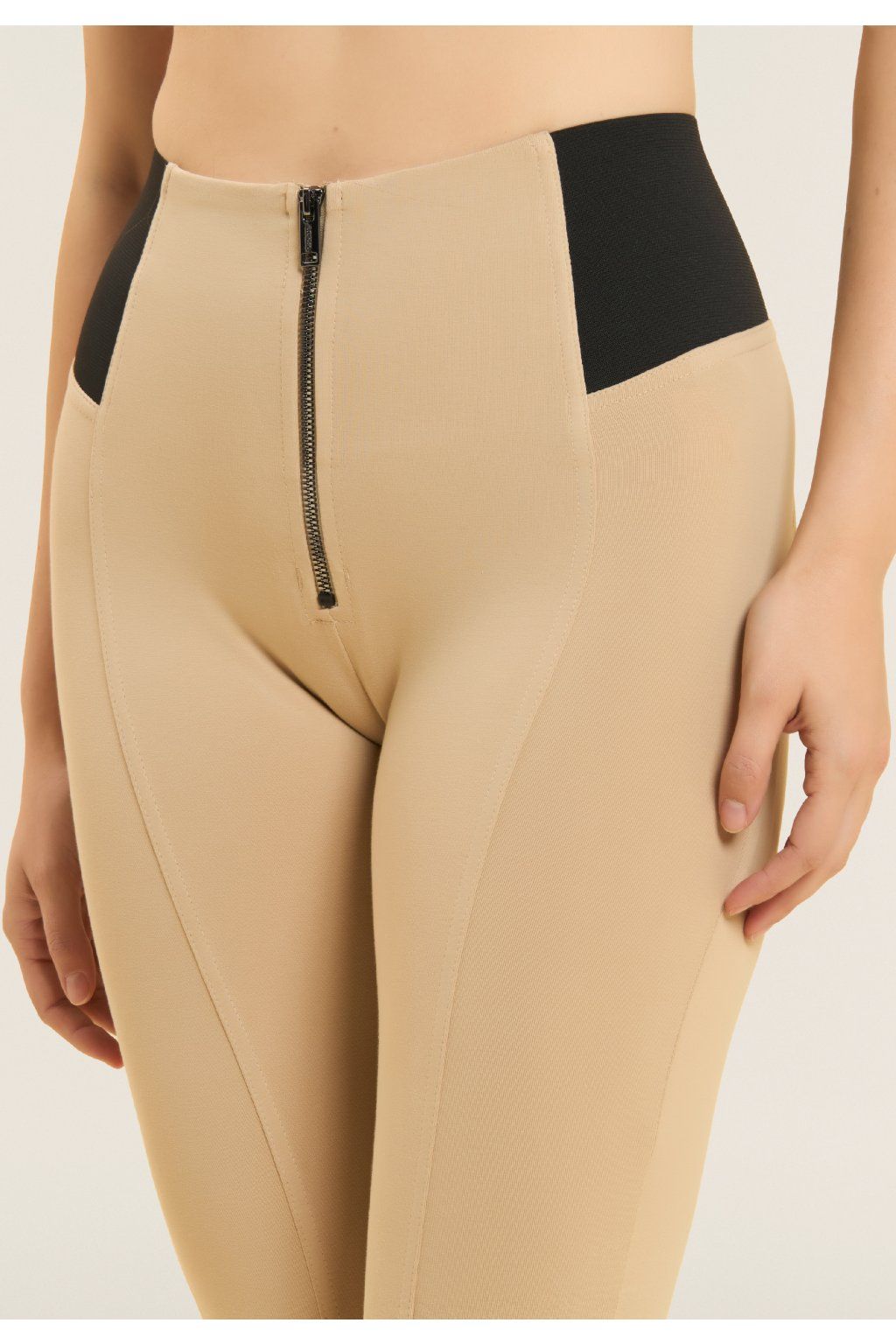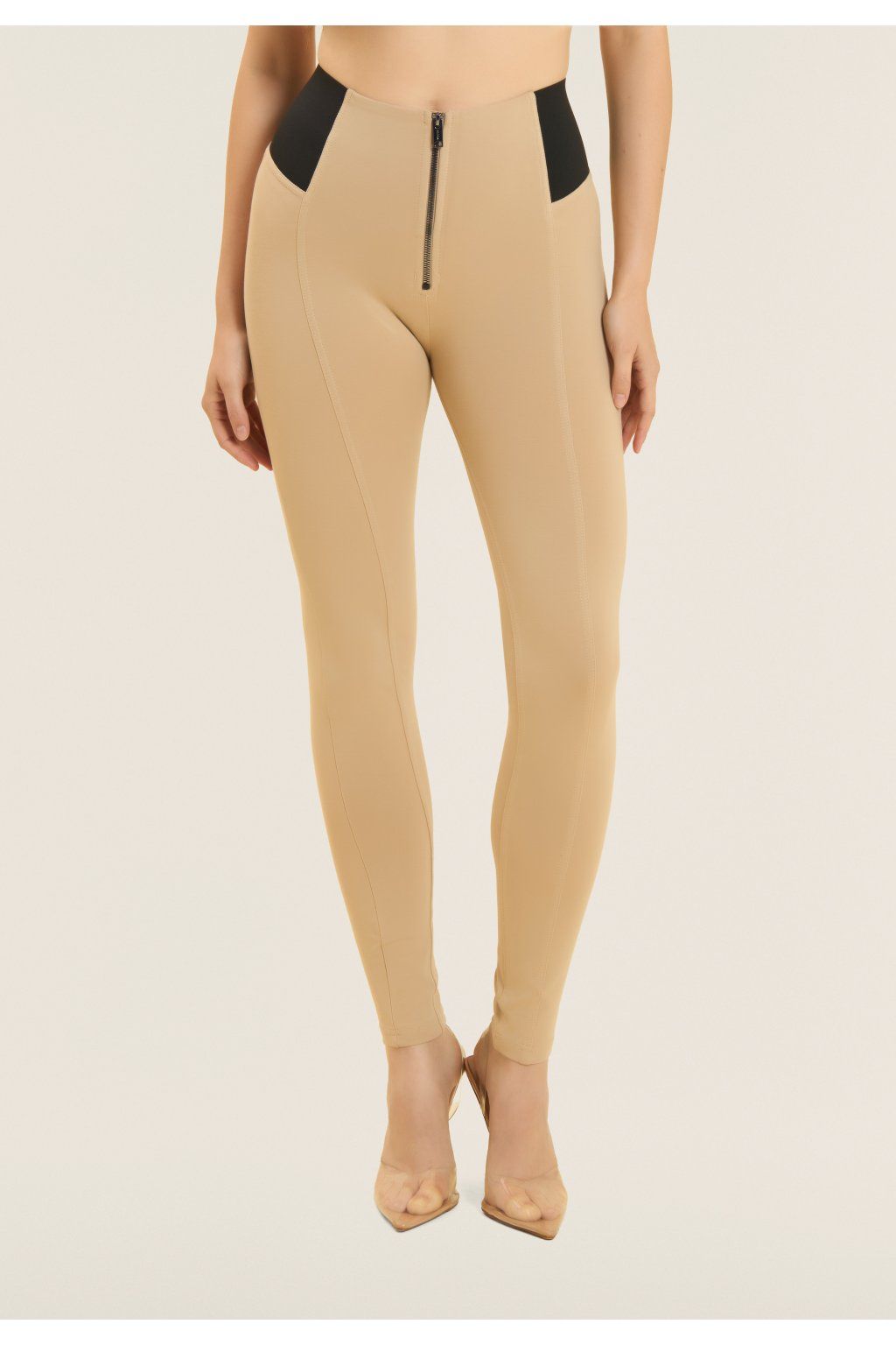 Tvarujúce nohavice WR.UP® z elastického bavlneného džerseja s vysokým pásom, bočnými gumičkami a zapínaním na zips vpredu. Tento štýl má pravidelnú dĺžku a superštíhly strih, ktorý priliehavo obopína telo a je ešte viac zdôraznený prešívaním v strede nohavíc.