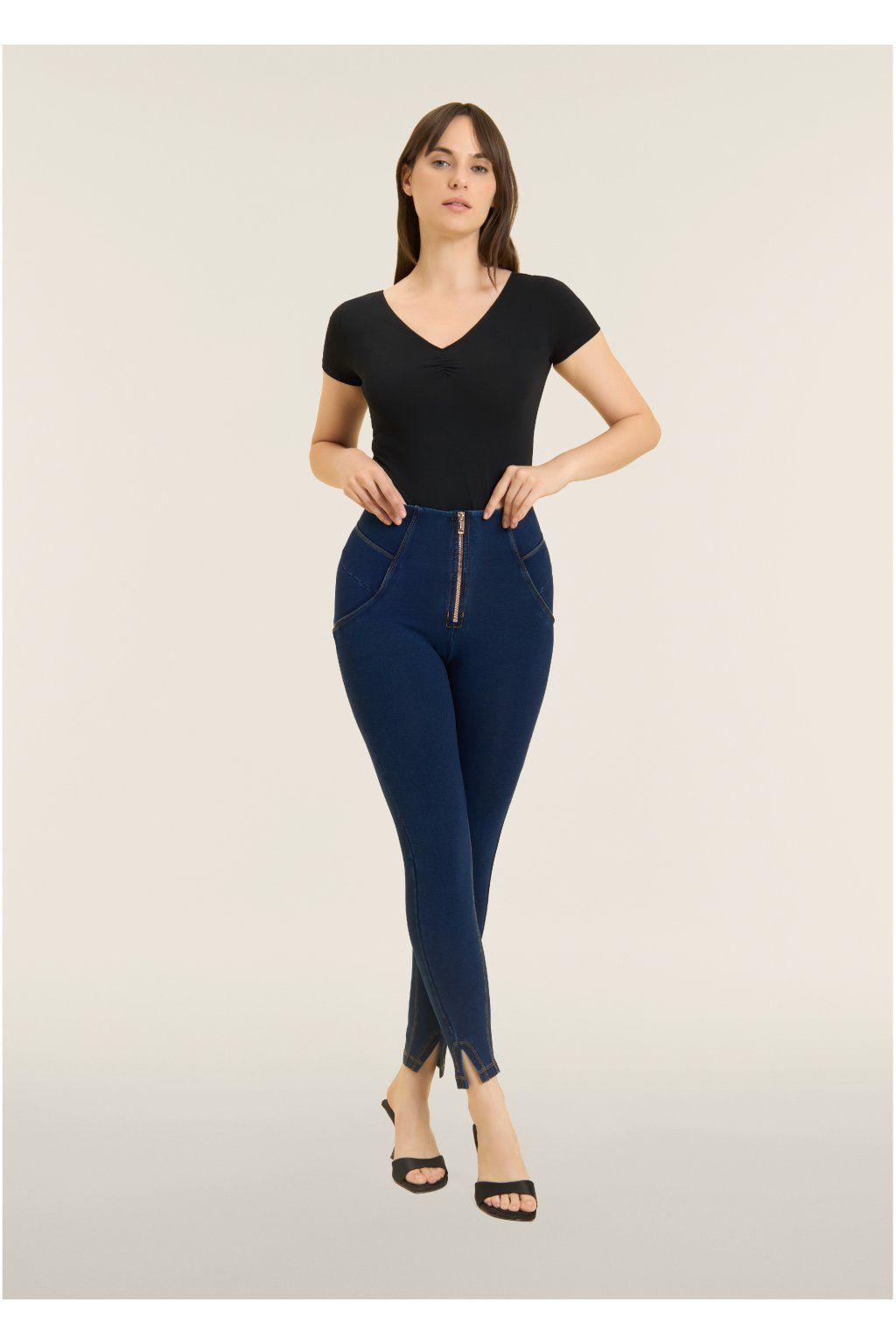 Veľmi vysoký pás, nohavice po členky a superštíhly strih spolu príjemne obopínajú vaše krivky a zvýrazňujú vašu ženskosť. Strih je ešte viac vylepšený patentovanou technológiou Freddy's WR.UP®, inovatívnym systémom švov a vložiek, ktoré dokonale tvarujú a zdvíhajú siluetu.