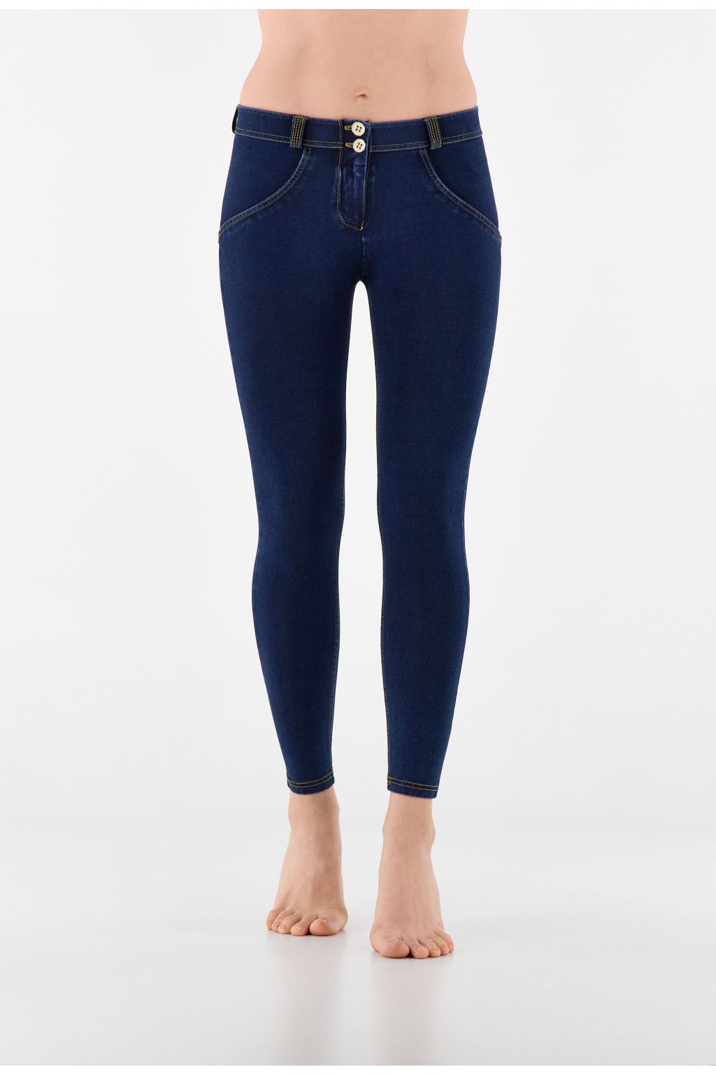WR.UP® denim nohavice tmavo modré so žltým šitím,7/8, regular pás RE(MOVE)