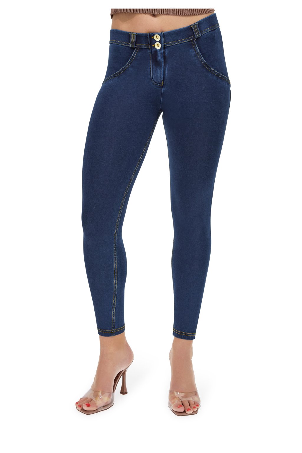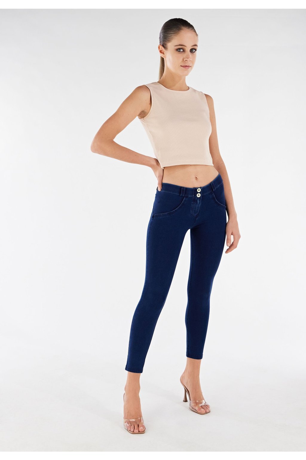 Modelovacie push-up nohavice z radu WR.UP® vyrobené z organickej bavlny a recyklovaného elastanu. Model má bežný regularný pás so zapínaním na dva gombíky, 7/8 dĺžku v oblasti členku, ktorá zoštíhľuje nohu, a superskinny strih, ktorý poskytuje maximálnu priľnavosť.
