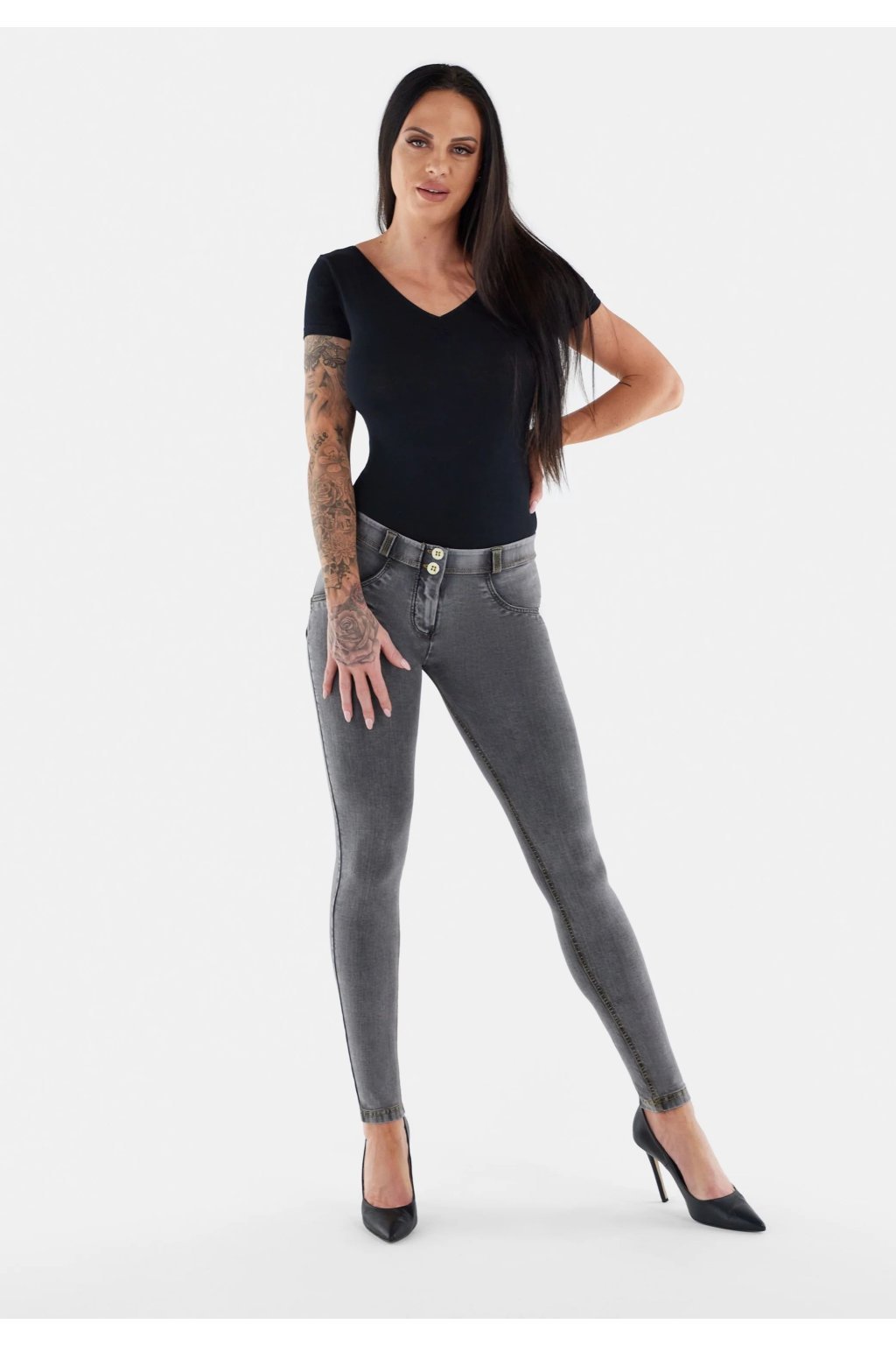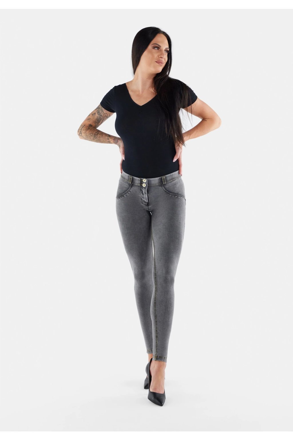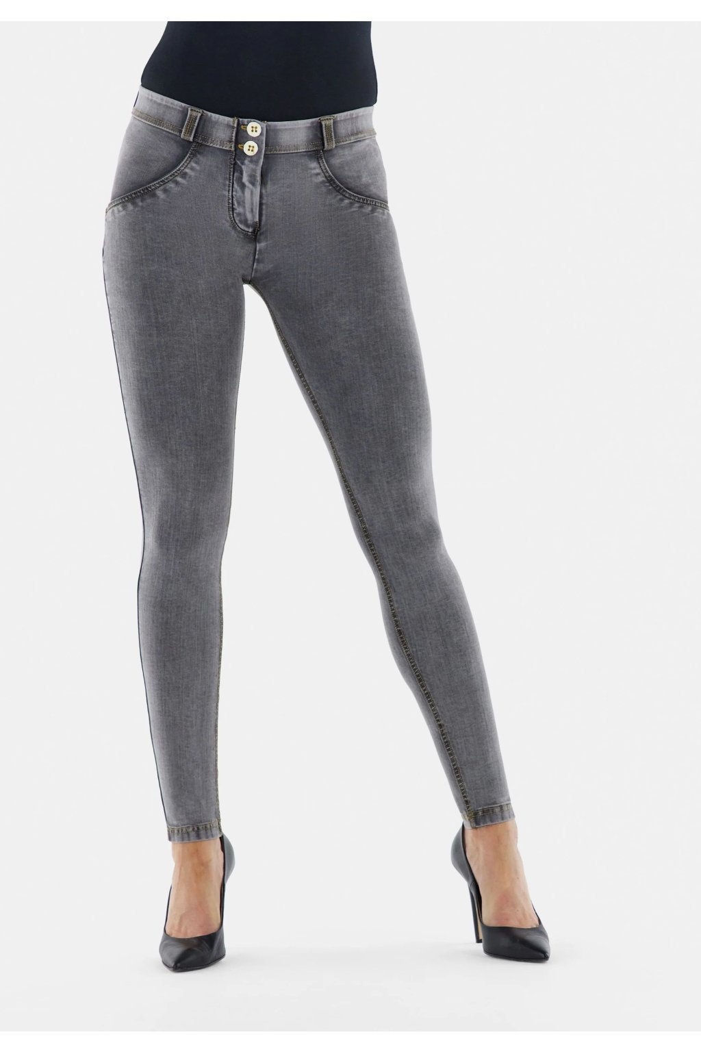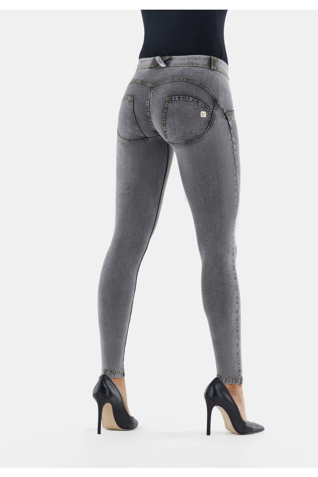 Tvarujúce nohavice z radu WR.UP® so vzhľadom čiernej-pranej rifľoviny. Hladká, pružná tkanina vyrobená v Taliansku, vyrobená z odolných, ekologických celulózových vlákien, je chladivá a priedušná. Pravidelný pás; noha normálnej dĺžky. Tenký strih, ktorý objíma línie tela, tvaruje a pozdvihuje ženské krivky vďaka Freddyho patentovanej technológii WR.UP®. Tento špeciálny systém vložiek a švov zvýrazňuje siluetu a poskytuje oporu na všetkých správnych miestach pre lákavú príťažlivosť. Zloženie: 82%Lyocell 18%Elastan