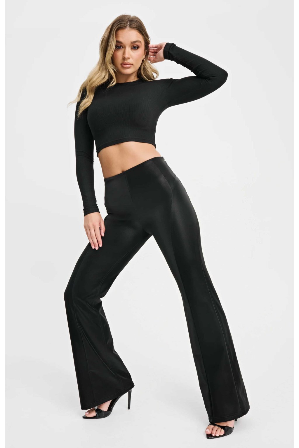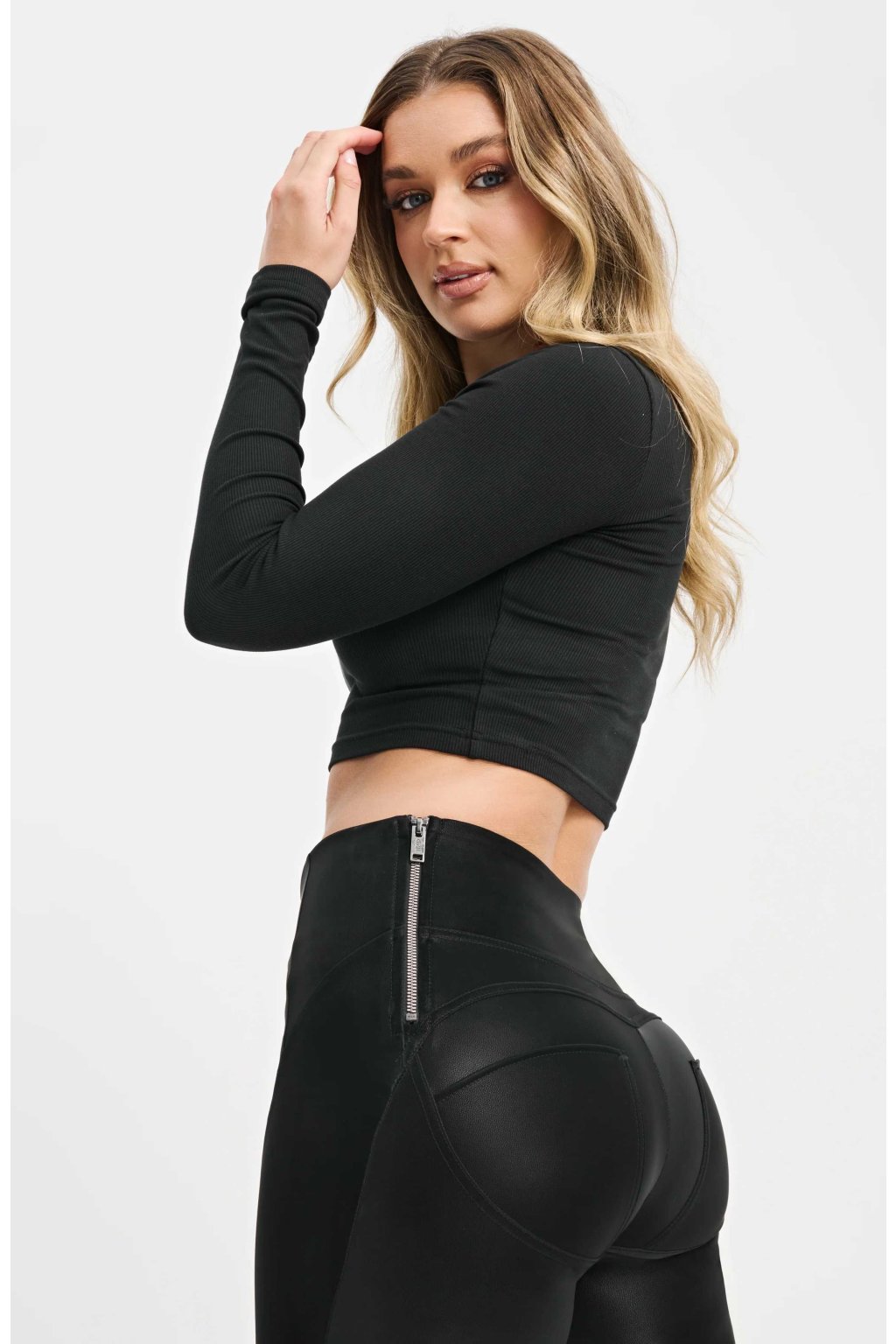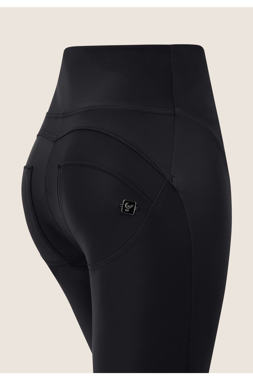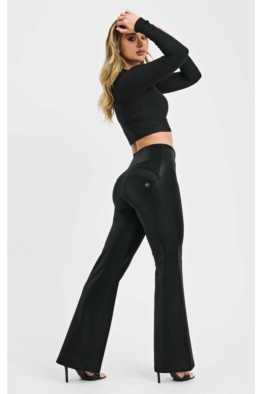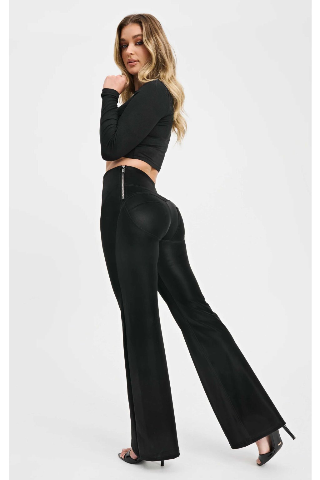 Tieto WR.UP® push-up nohavice s lesklým efektom a super rozšíreným lemom zvýrazňujú akýkoľvek vzhľad. Sú vyrobené z ekologickej imitácie kože, obzvlášť lesklej látky vďaka mokrému efektu, vyrobeného z polyesteru s nízkym dopadom na životné prostredie, ktorý sa získava z plastových fliaš transformovaných na nové vlákno. Tieto nohavice sú ideálne na zvýraznenie ženskej postavy vďaka tvarovaciemu efektu, ktorý poskytuje technológia WR.UP® patentovaná Freddym, zatiaľ čo hra stehov na bokoch a dĺžka nohavíc dáva pohyb spolu so šírkou zadočku.