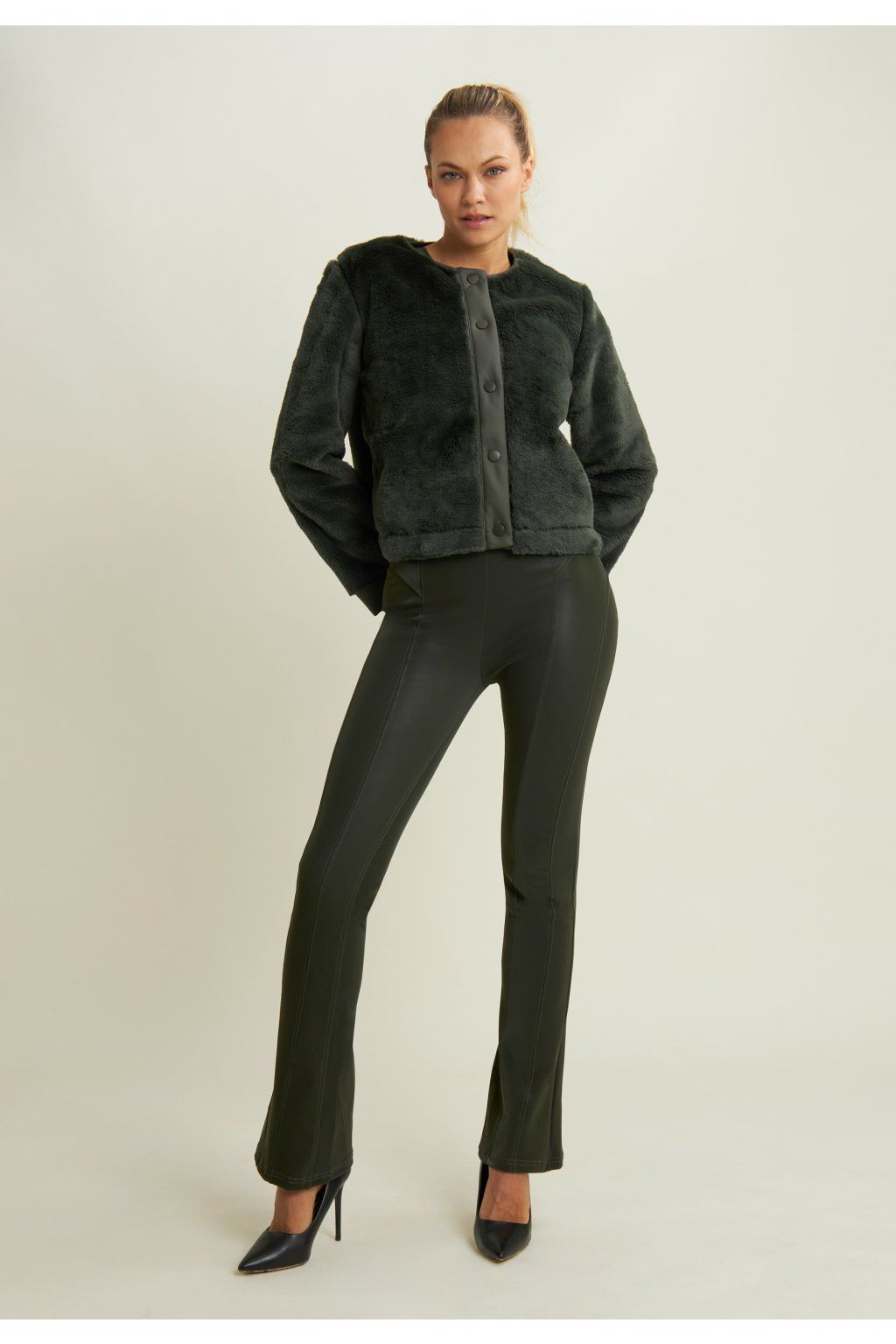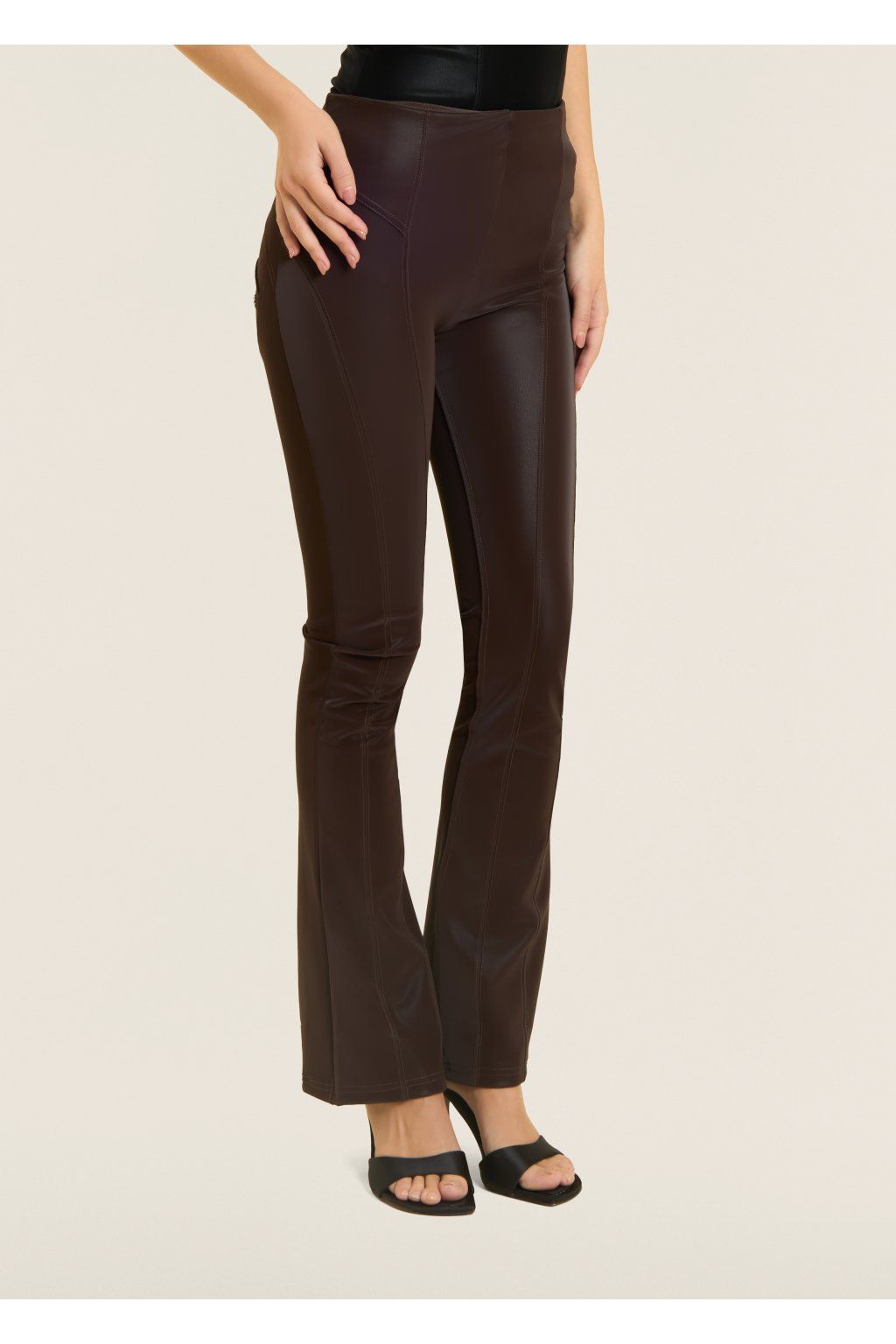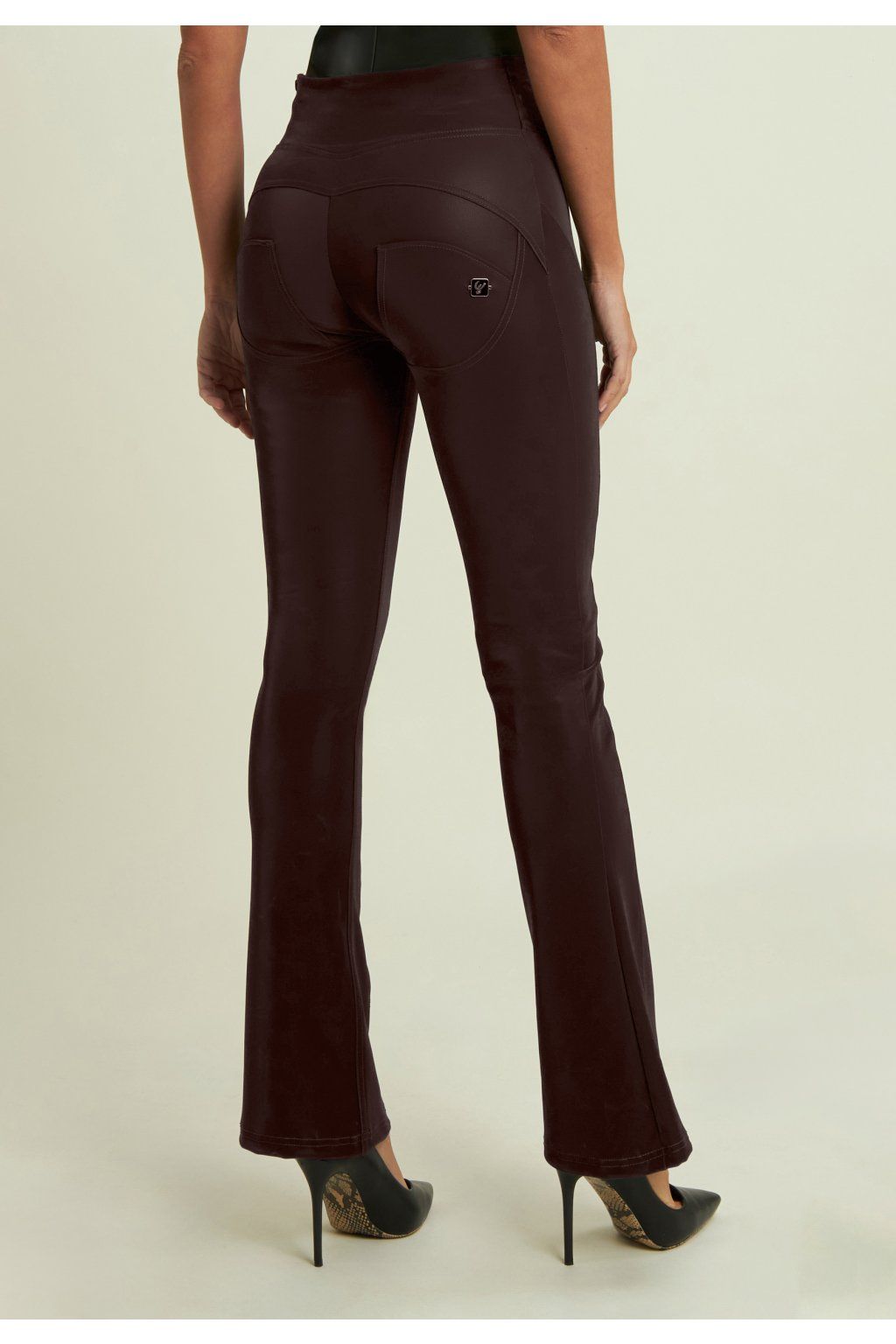 WR.UP® super skinny push-up nohavice z recyklovanej koženky so semišovým efektom a mierne rozšíreným zvonovým strihom. Vertikálne prešívanie po celej dĺžke nohavíc opticky zoštíhľuje nohy a zvýrazňuje siluetu pre odvážny a ženský vzhľad. Vysoký pás so zapínaním na boku.
