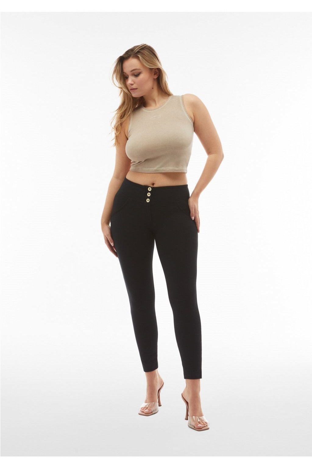 Push-up nohavice z bioaktívnej tkaniny WR.UP® so stredne vysokým pásom. Majú zapínanie na tri gombíky, pravidelnú dĺžku a superštíhly strih pre maximálne priľnutie ku kontúram tela. Tento odev spája inovácie značky Freddy, aby ste mohli ukázať svoju ženskosť vďaka kombinácii tkaniny D.I.W.O.® Plus, vyrobenej z recyklovaných materiálov a ošetrenej technológiou Tana® Care Bio, ktorá podporuje tepelnú reguláciu a prispieva k zlepšeniu vzhľadu pokožky, a príjemného tvarujúceho efektu, ktorý ponúka technológia WR.UP® patentovaná značkou Freddy, ktorá zvýrazňuje postavu a poskytuje modelujúci a zdvíhajúci efekt pomocou jedinečného systému vložiek a šitia.