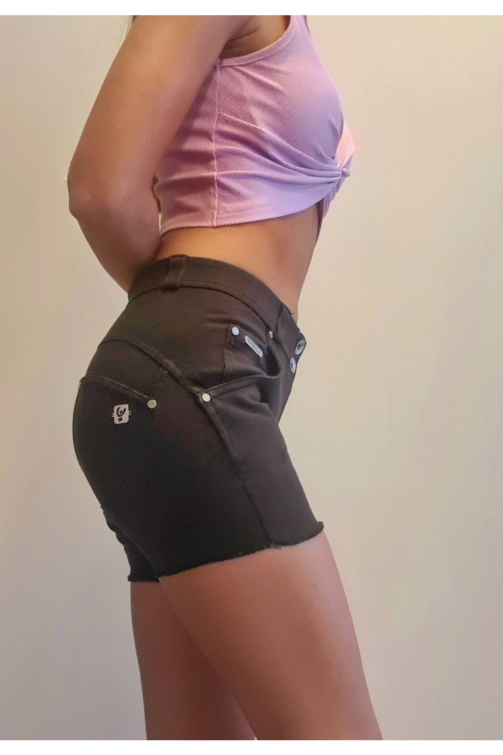 Šortky z radu WR.UP® navrhnuté tak, aby zvýraznili vaše tvary bez toho, aby ste sa vzdali potešenia zo slobody pohybu. Majú pravidelný pás s pútkami na opasok a zapínaním na dva gombíky, skutočné predné a zadné vrecká, rozstrapkaný lem a úzky strih pre príjemné priľnutie k líniám tela. Klasický päťvreckový dizajn s kovovými nitmi je kombinovaný s príjemným tvarovacím efektom, ktorý poskytuje inovatívna technológia WR.UP® patentovaná Freddym, ktorá zvýrazňuje siluetu a dáva tvarovací a push-up efekt pomocou špeciálneho systému vložiek a šitie .