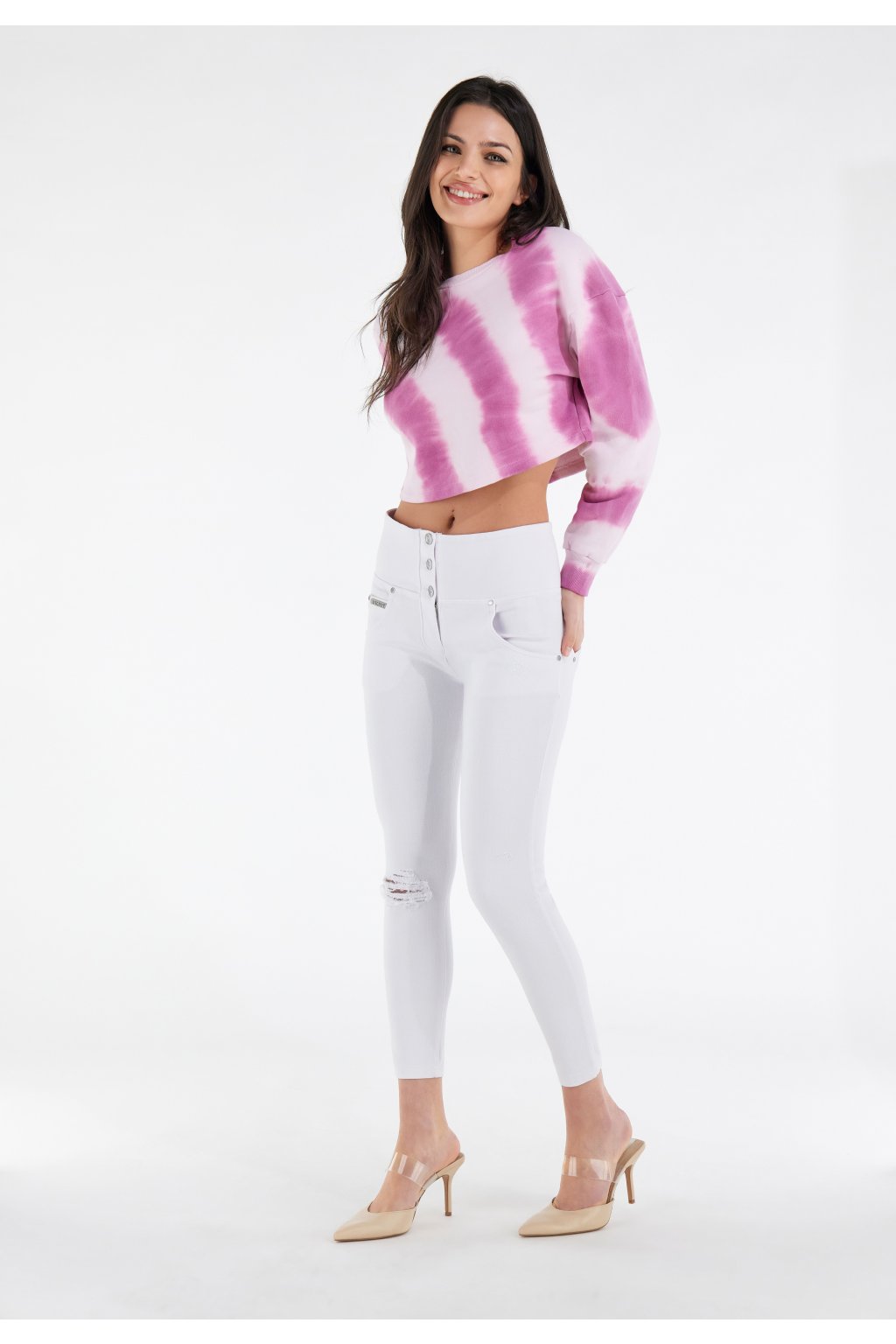 Push-up nohavice WR.UP® s vysokým pásom so zapínaním na tri gombíky, ktoré sa obopínajú a definujú líniu pásu, vyznačujúce sa roztrhnutím na kolene a malými odreninami, ktoré vytvárajú autentický a živý dotyk. Sú vyrobené z ekologickej, strečovej a na odev farbenej tkanej tkaniny vyrobenej z organickej bavlny, rôznych ekologických priadzí a TENCEL™ Lyocell, vlákna získaného z eukalyptovej rastliny.