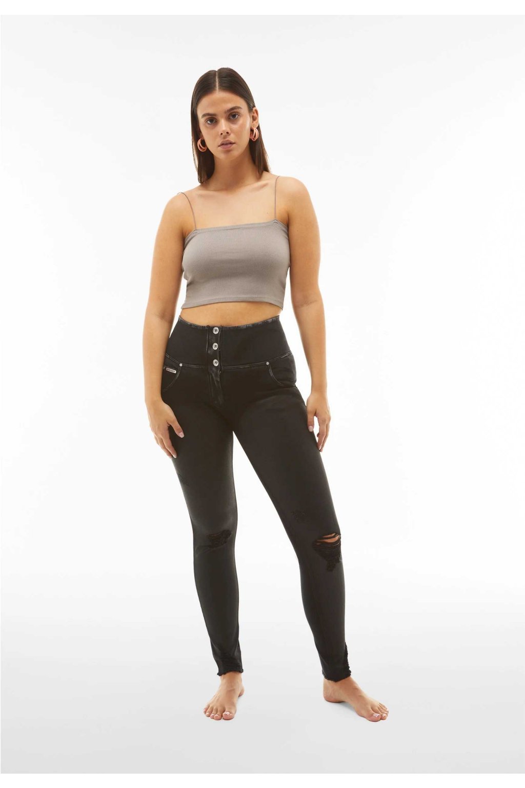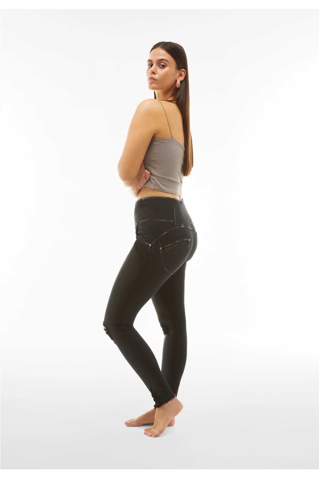 Roztrhané džínsy WR.UP® z ekologického čierneho strečového tkaného denimu so záterom na prednej časti. Sú ideálne ku každému outfitu, ktorého cieľom je zvýrazniť vašu postavu bez toho, aby ste obmedzovali voľnosť pohybu. Autentický pocit z tohto odevu je zvýraznený klasickým skutočným päťvreckovým dizajnom s kovovými nitmi, ktoré sa spájajú s udržateľným duchom, ktorý pochádza z látky vyrobenej s použitím organickej bavlny, rôznych ekologických priadzí a TENCEL™ Lyocell, získaného ekologického vlákna. z eukalyptovej rastliny.
