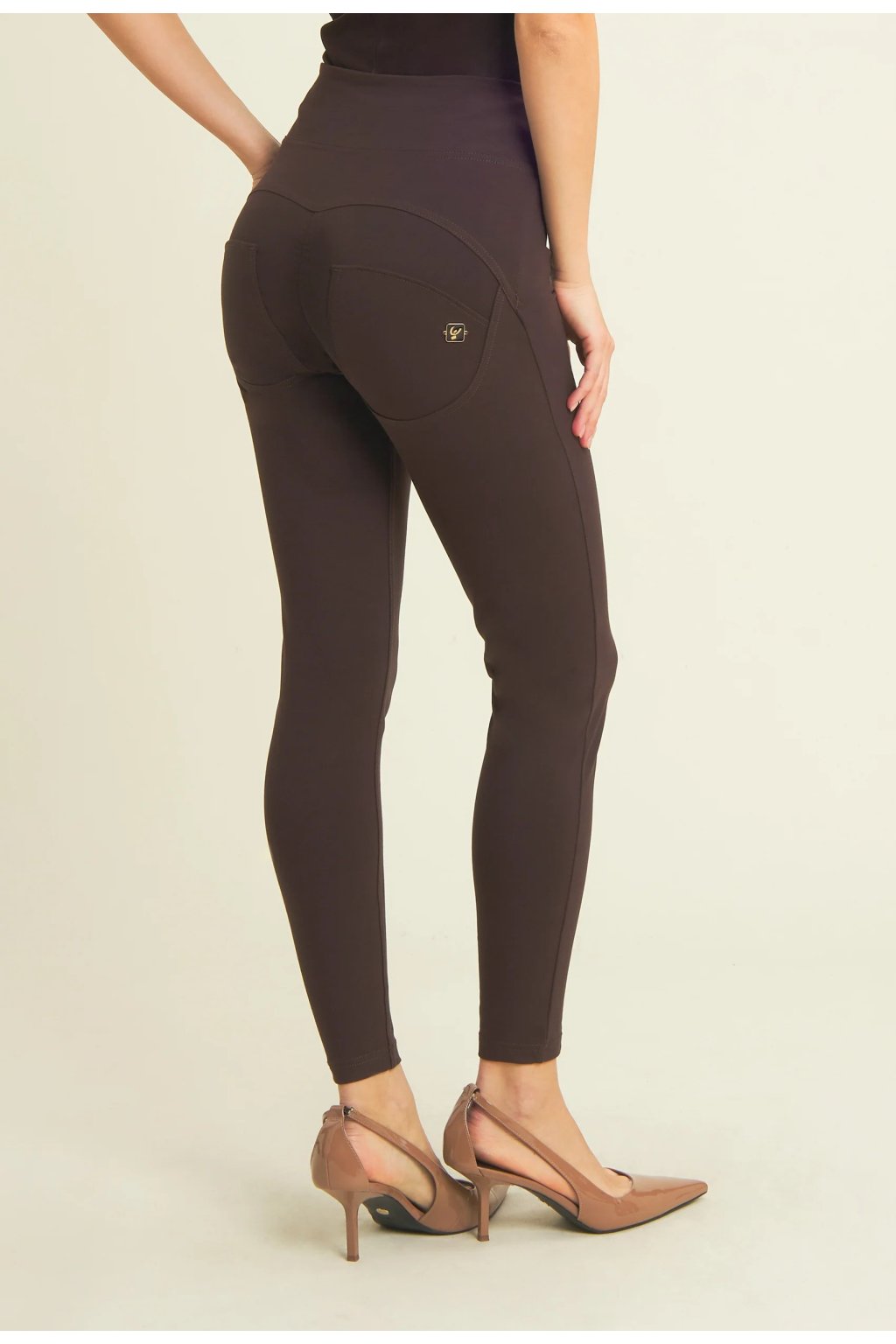 WR.UP® super skinny push-up 7/8 nohavice z hrubého organického strečového džerseja. Dekoratívne stuhy v páse, upevnené veľkými zlatými nitmi, a stredové prešívanie pozdĺž nôh dodávajú odevu charakter a originalitu. Majú vysoký pás so stredovým zipsom.