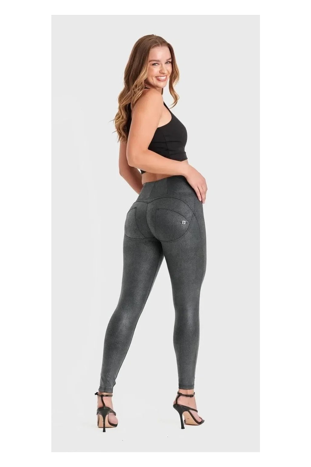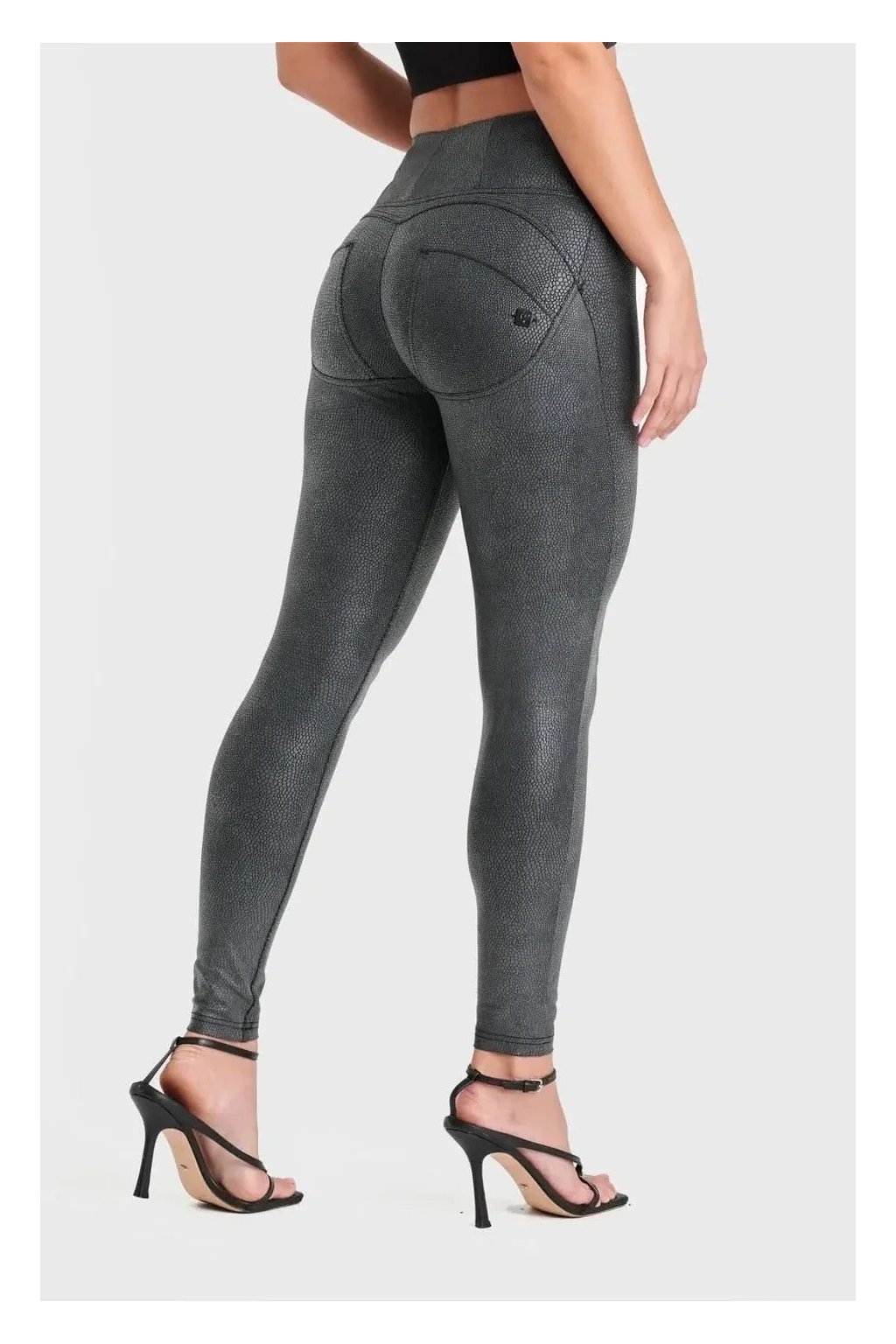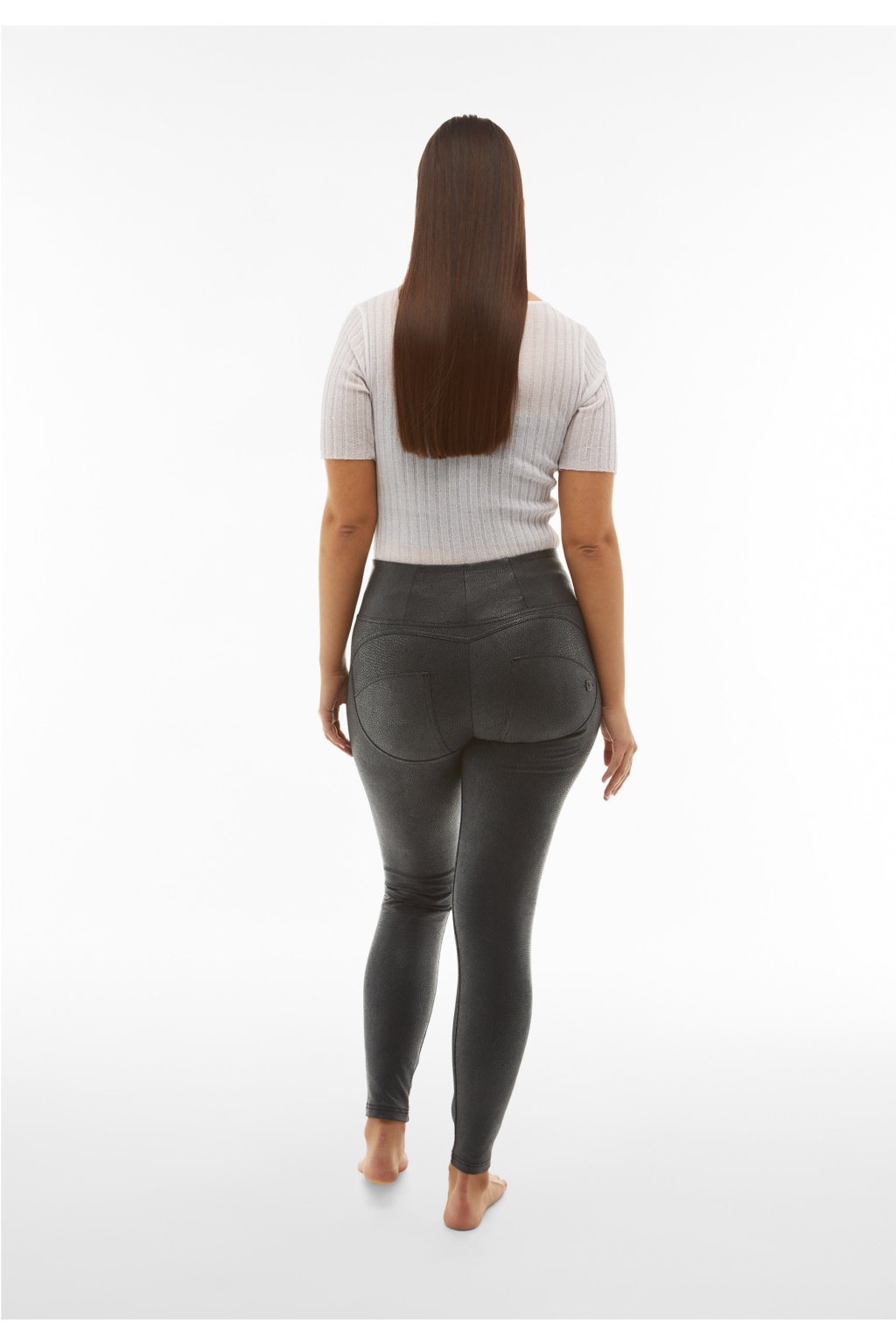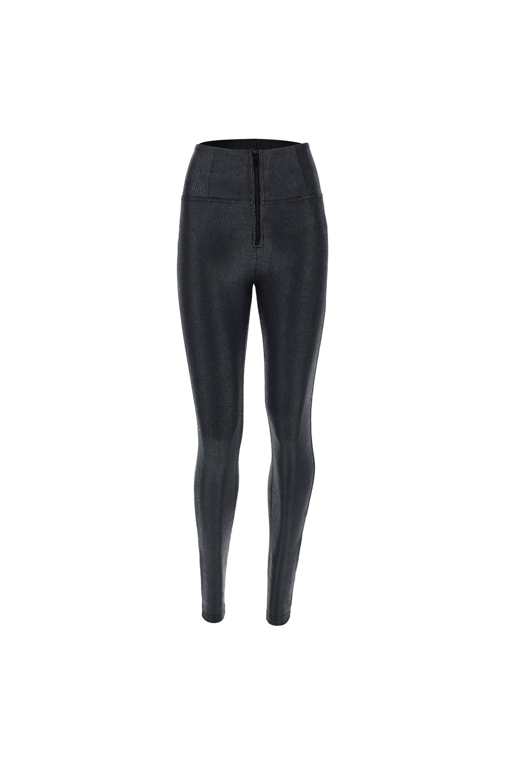 Push up nohavice WR.UP® superštíhleho strihu z elastickej ekologickej umelej kože s textúrou hadej kože, vyrobené z recyklovaného materiálu. Model má vysoký pás so zapínaním na zips vpredu, ktorý obopína pás s pravidelnou dĺžkou.