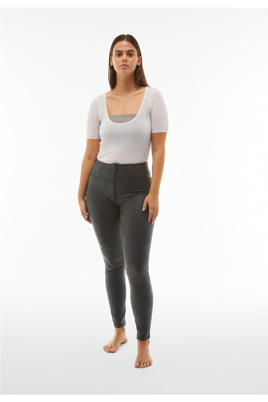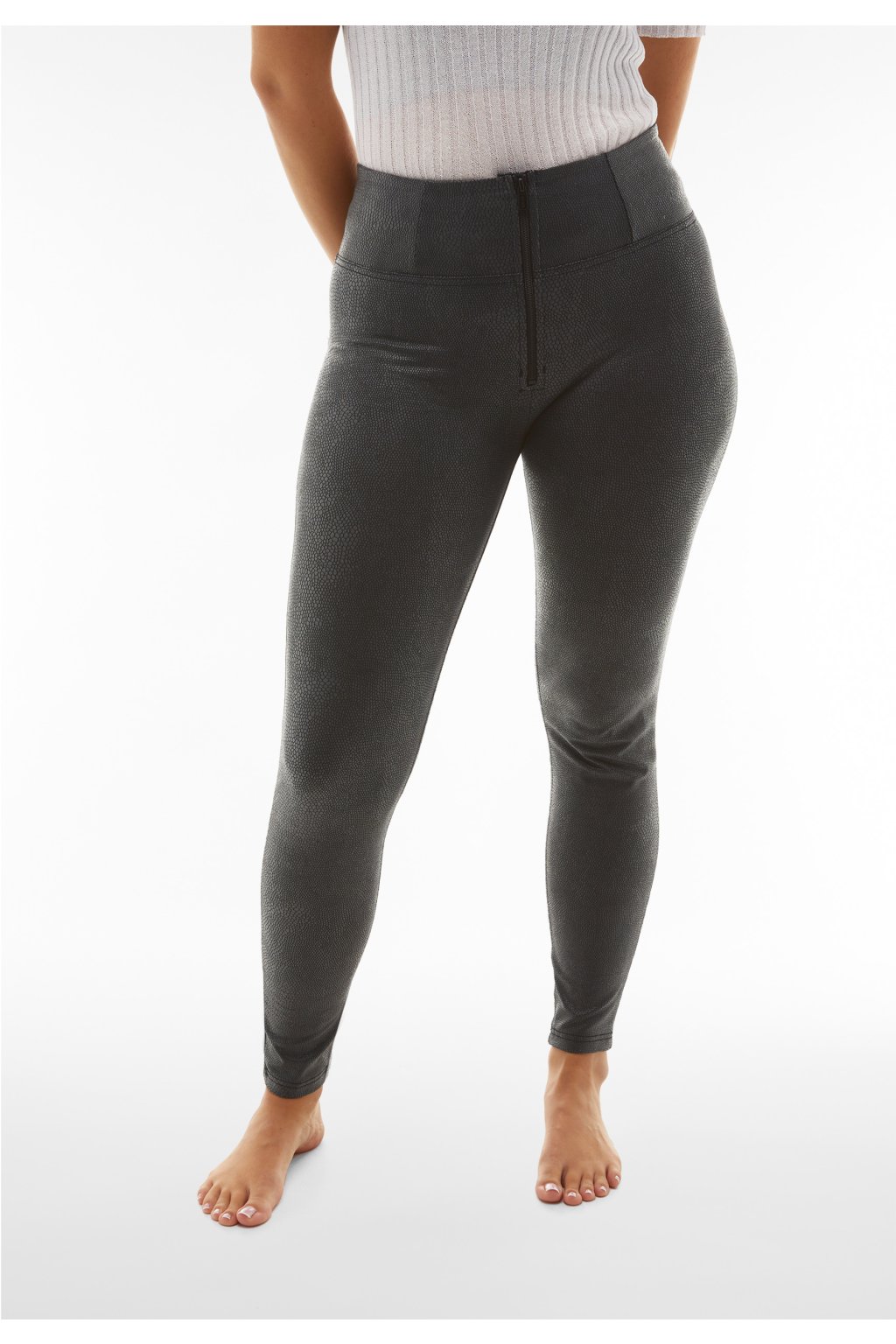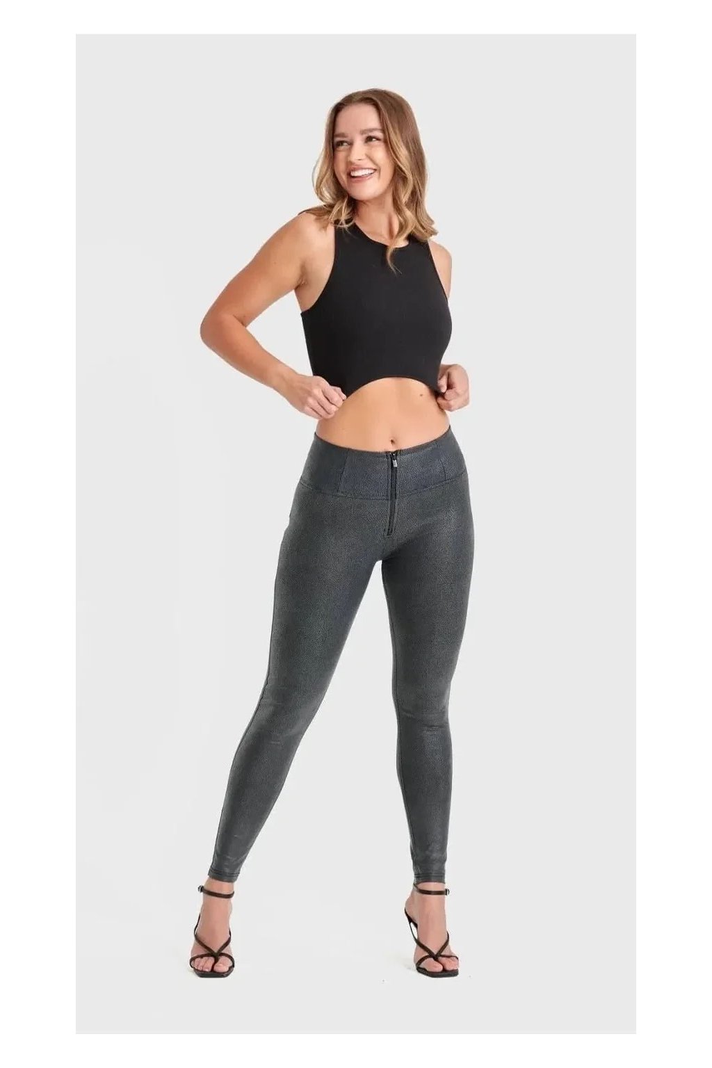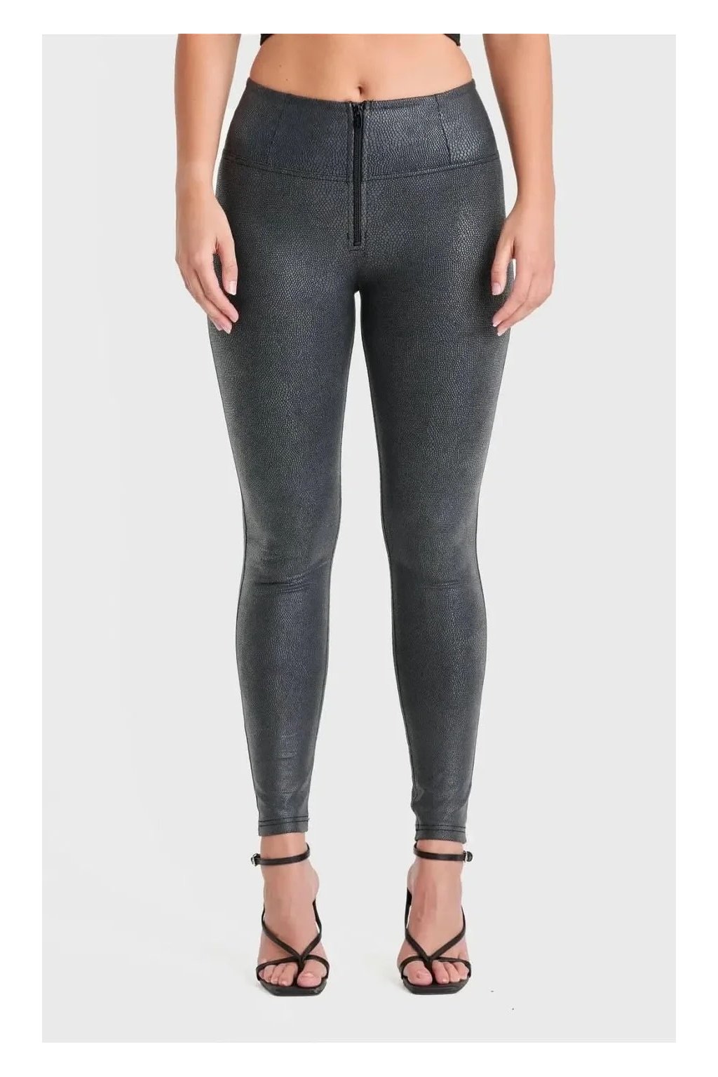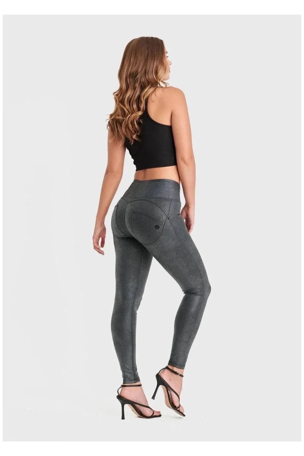 Push up nohavice WR.UP® superštíhleho strihu z elastickej ekologickej umelej kože s textúrou hadej kože, vyrobené z recyklovaného materiálu. Model má vysoký pás so zapínaním na zips vpredu, ktorý obopína pás s pravidelnou dĺžkou.